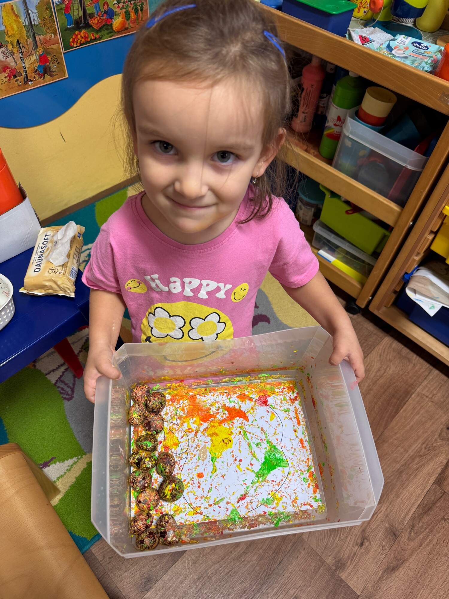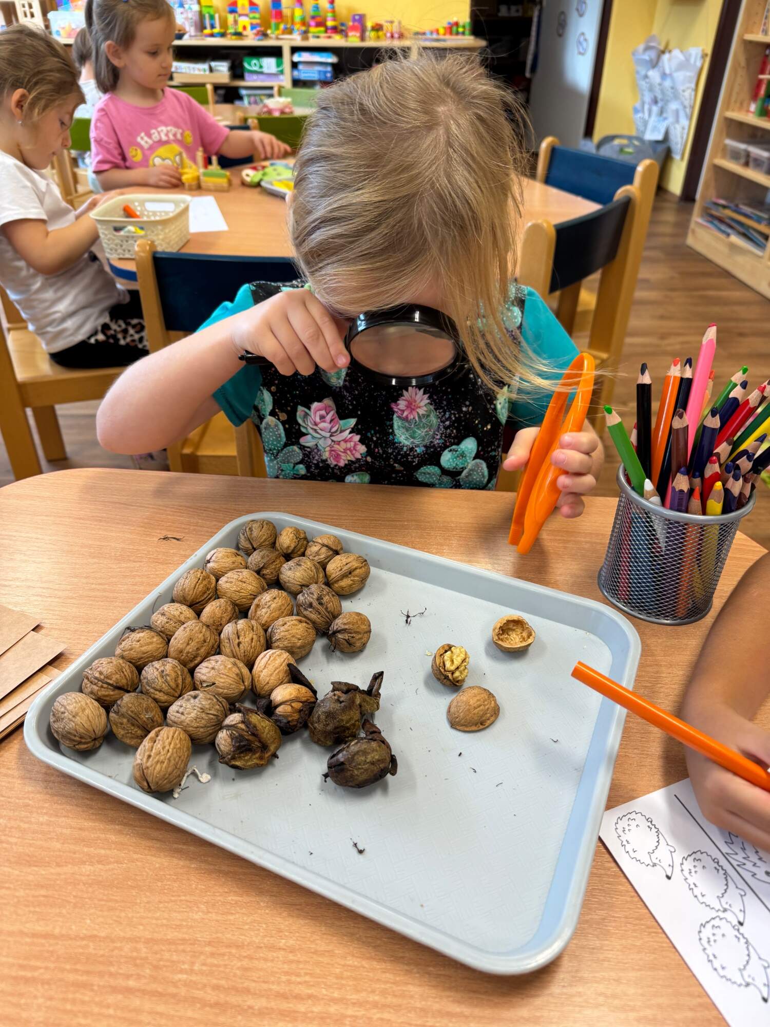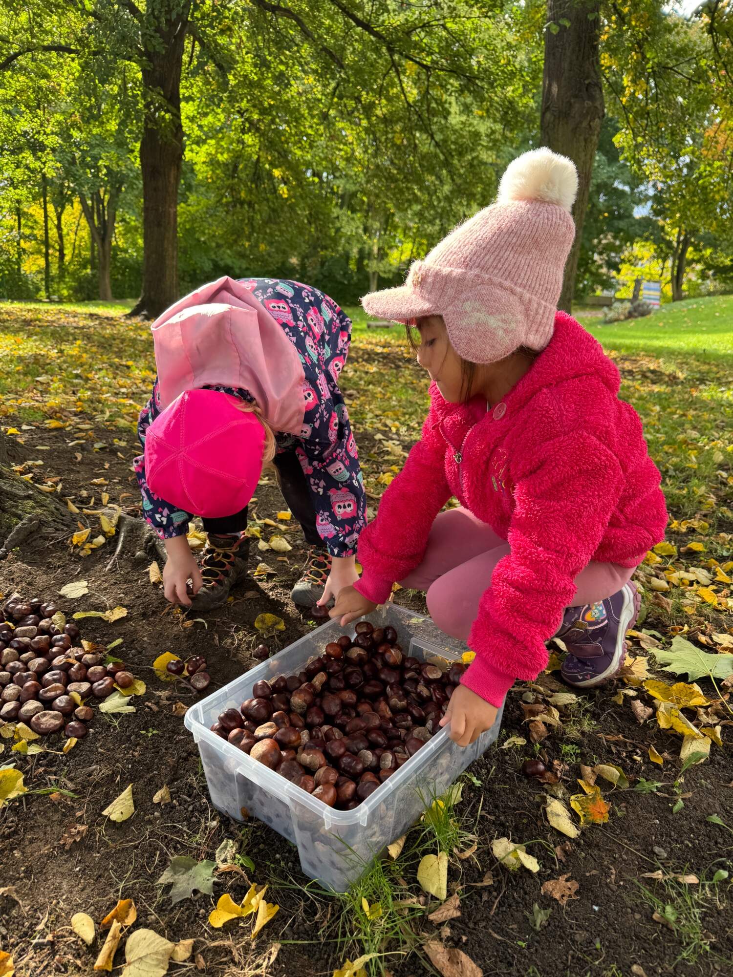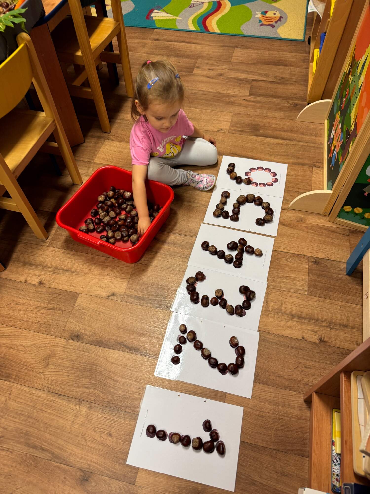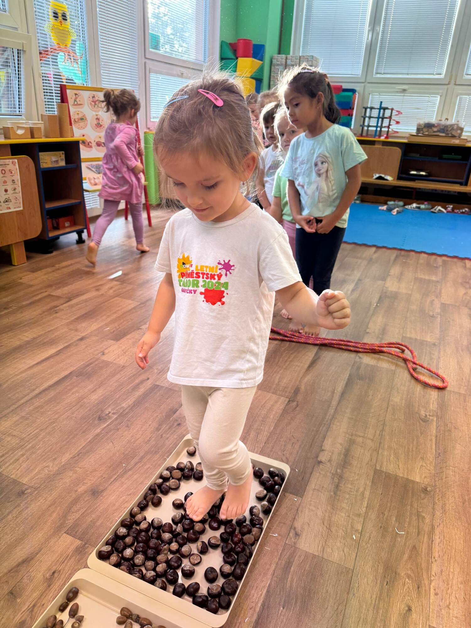 Do třídy Rybiček se vplížil podzim – tiše, po špičkách, a přinesl s sebou vůni lesa, barevné listí a košík plný pokladů z přírody. Děti si společně přinesly podzimní plody – kaštany, žaludy, šišky i oříšky – a pečlivě je zkoumaly, třídily, počítaly a nakonec z nich vytvořily krásné výtvory. Malování pomocí kaštanů byla velká zábava – občas se sice kaštan „kutálel víc, než měl“, ale o to víc smíchu ve třídě zaznělo!