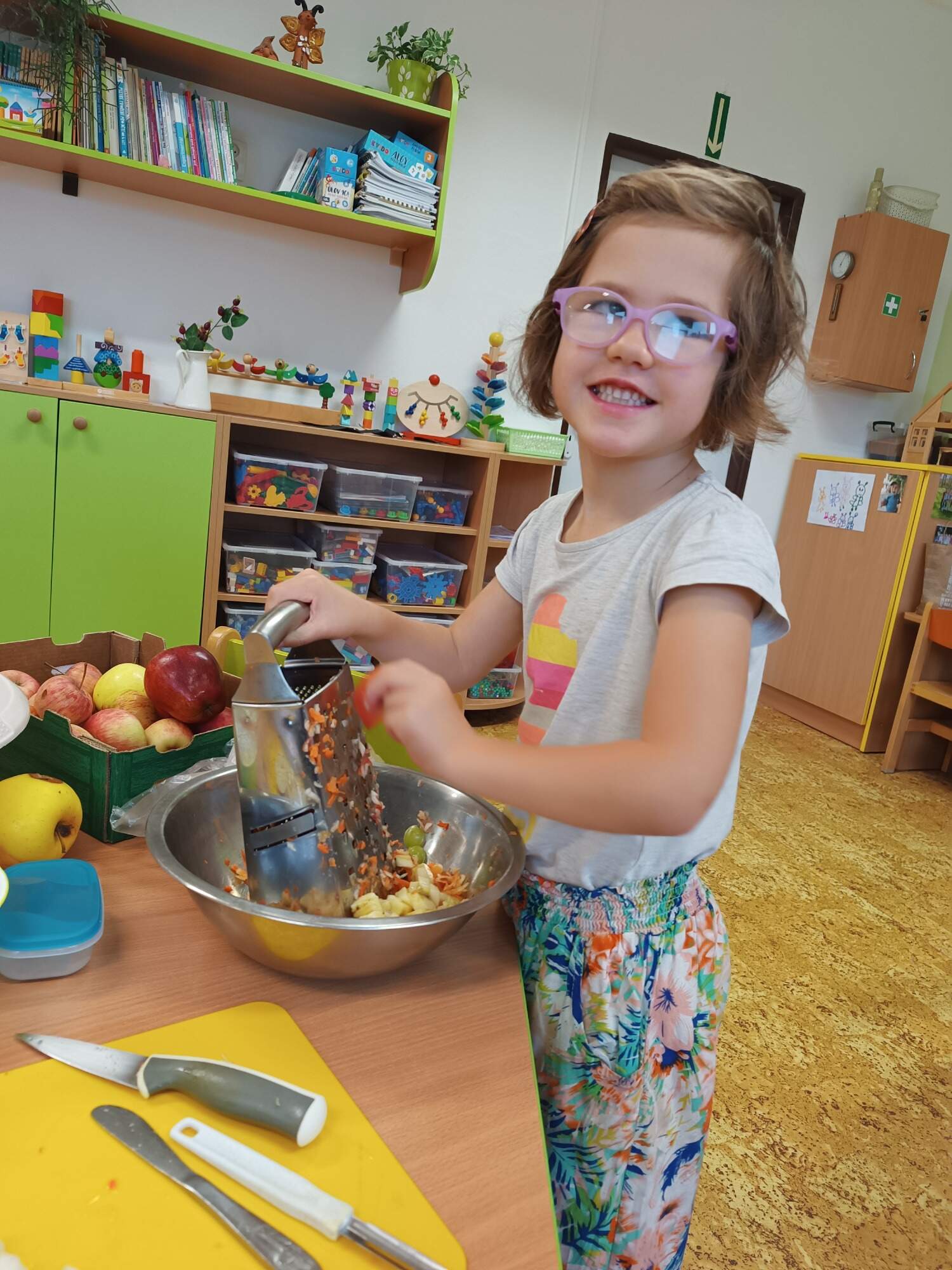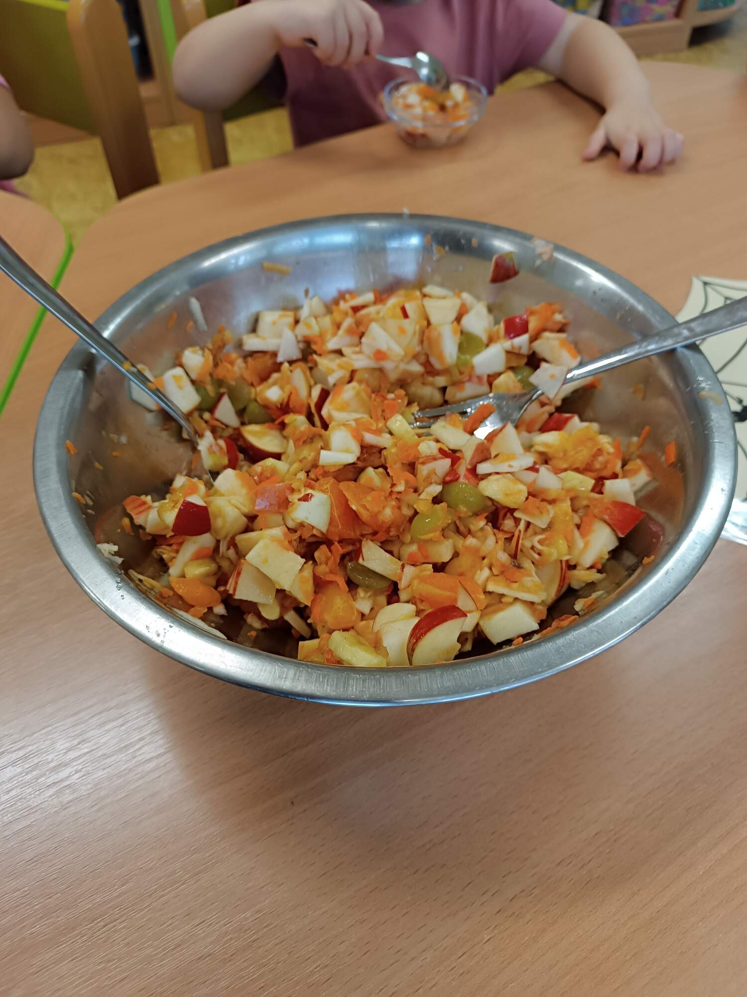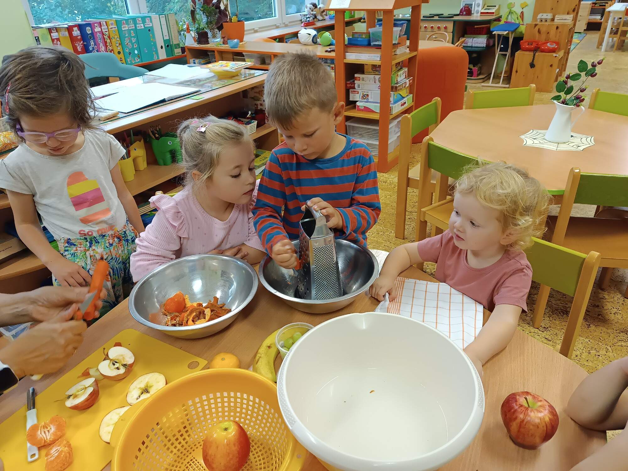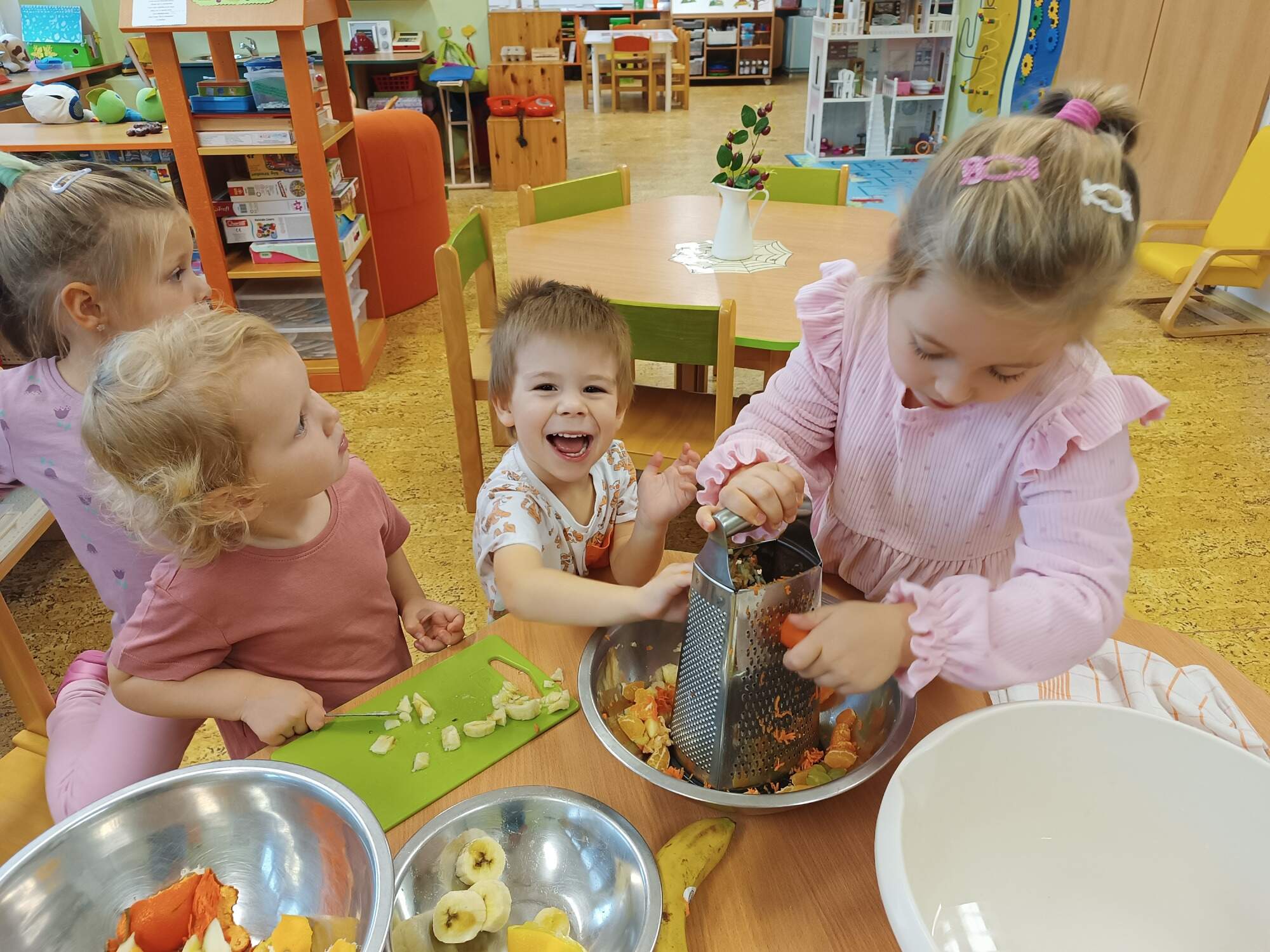 Naši Motýlci si vyzkoušeli, jaké to je být malými kuchaři – připravovali si totiž vlastní ovocný salátek. Společně jsme si nejprve povídali o tom, jaké ovoce a zeleninu známe a vysvětlili si, že ovoce a zelenina obsahují mnoho vitamínů, které nám pomáhají zůstat zdravý, zvlášť v chladnějších podzimních dnech. Poté už přišla ta nejzábavnější část – krájení, míchání a ochutnávání. Děti si s velkým nadšením samy připravovaly kousky ovoce, pomáhaly míchat a nakonec si společně pochutnaly na voňavém a barevném salátku.